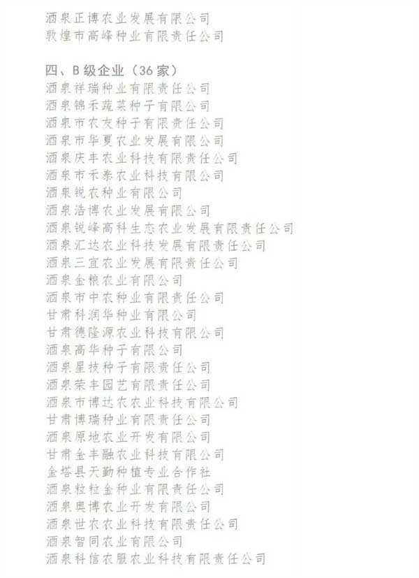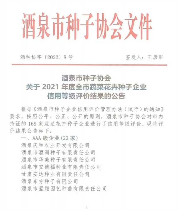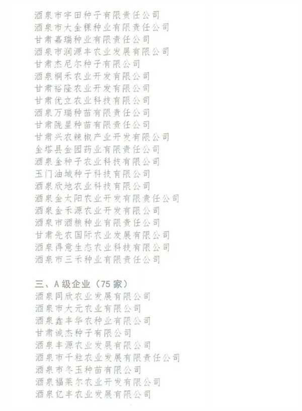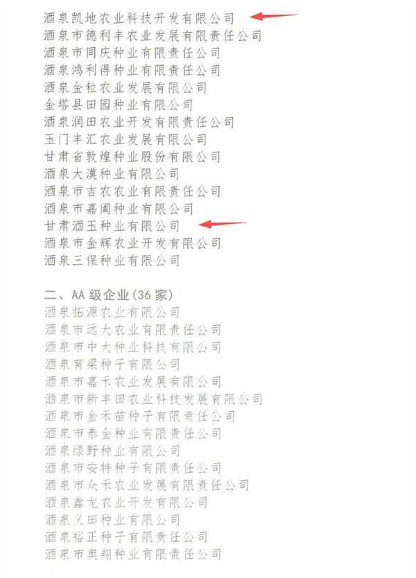 酒泉凱地農(nóng)業(yè)科技開發(fā)有限公司、甘肅酒玉種業(yè)有限公司被酒泉市種子協(xié)會評選為AAA級企..